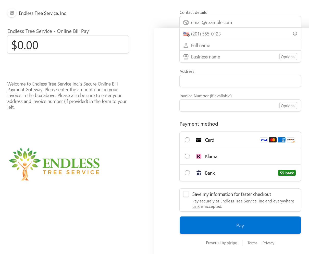 Click the [Pay My Bill] button or follow the link provided in your email. You will be redirected to our secure Stripe checkout page.